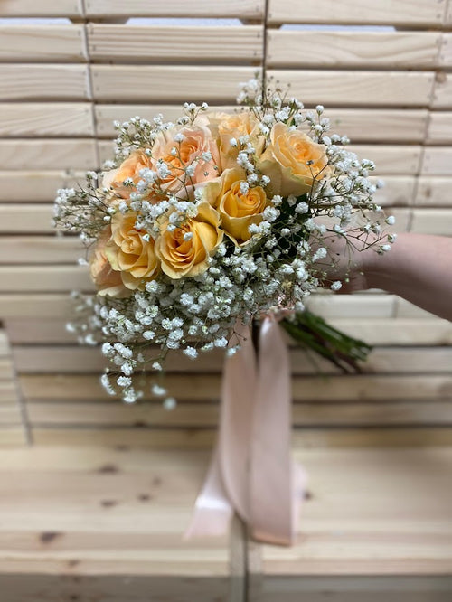 Buchet de mireasă cu trandafiri piersică și gypsophila – naturalețe și romantism