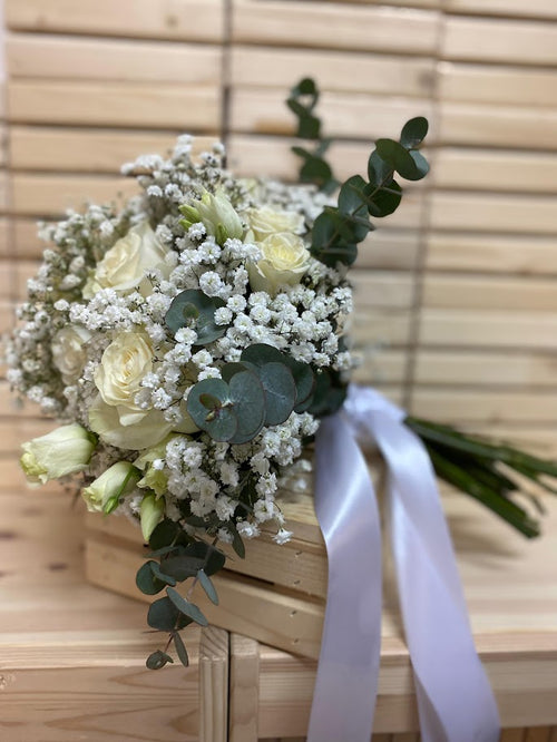Buchet de mireasă cu trandafiri albi, gypsophila și eucalipt – eleganță clasică și puritate