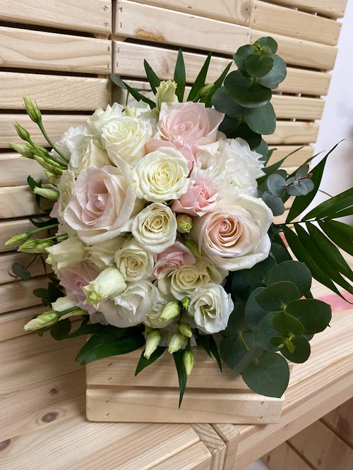 Buchet de mireasă cu trandafiri albi și blush, lisianthus și eucalipt – eleganță romantică